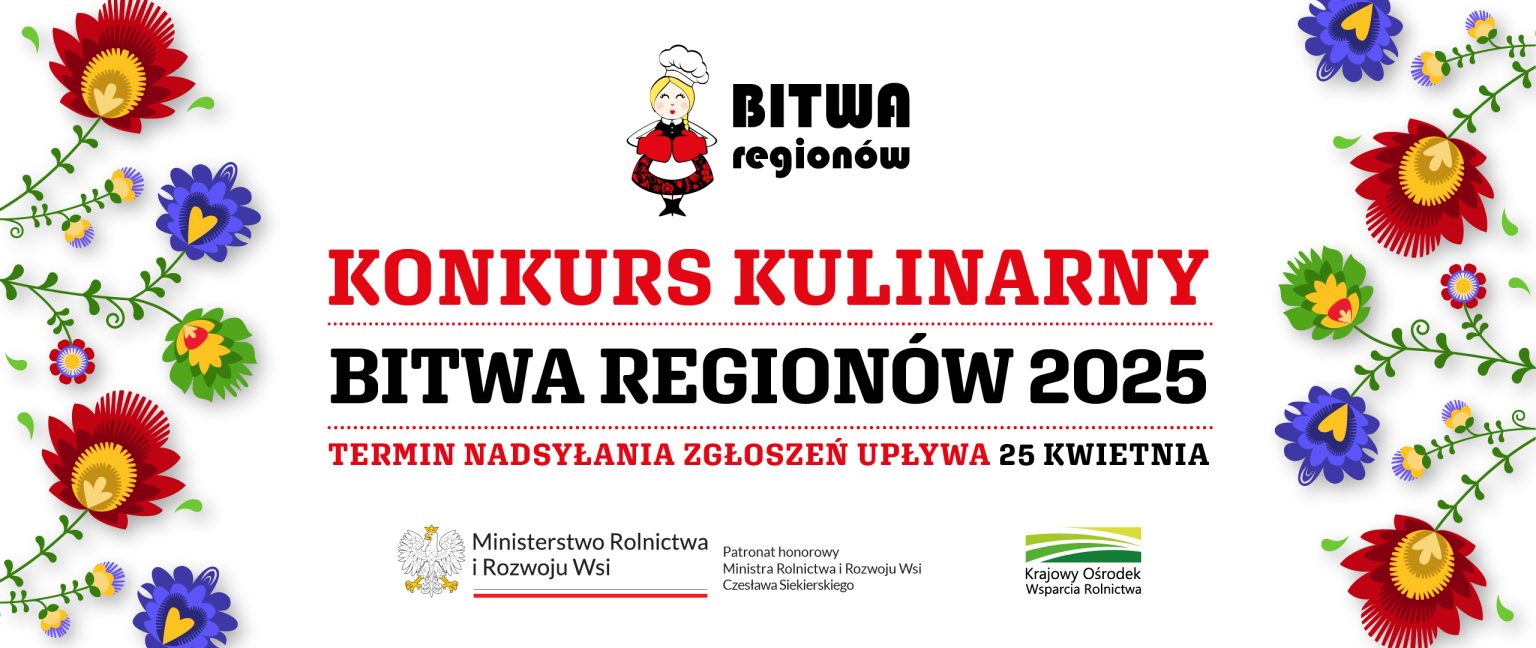 Trwa nabór zgłoszeń do X edycji Ogólnopolskiego Konkursu Kulinarnego „Bitwa Regionów”. Zapraszamy Koła Gospodyń Wiejskich i stowarzyszenia, którym bliskie są smaki regionów i dawne receptury, a wyjątkowe potrawy przygotowują z pasją i sercem.