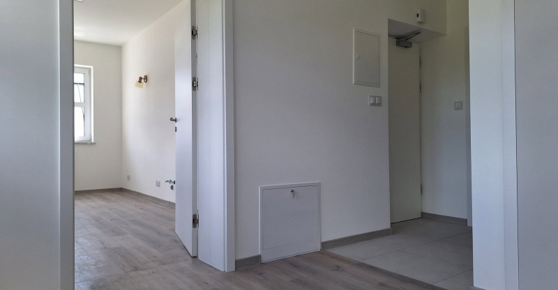 Wykonana została ściana działowa oraz obniżenie sufitów. Nowa posadzka wykonana została z płyt OSB posadowionych na legarach drewnianych z kotwiczeniem do ścian. Ponadto wykonano nową instalacje m.in. elektryczną oraz wodno – kanalizacyjną i nową wentylację. Zamontowano stolarkę drzwiową wraz z ościeżnicami opaskowymi. Podłoga została wykonana z paneli winylowych oraz płytek gresowych w pomieszczeniach mokrych wraz z cokolikami. Pod oknami zamontowano nowe parapety z aglomarmuru. W pomieszczeniu toalety zamontowano ustęp z płuczką ustępową typu kompakt, grzejnik elektryczny, umywalkę, lustro, wieszaki na ręczniki, uchwyt na papier.