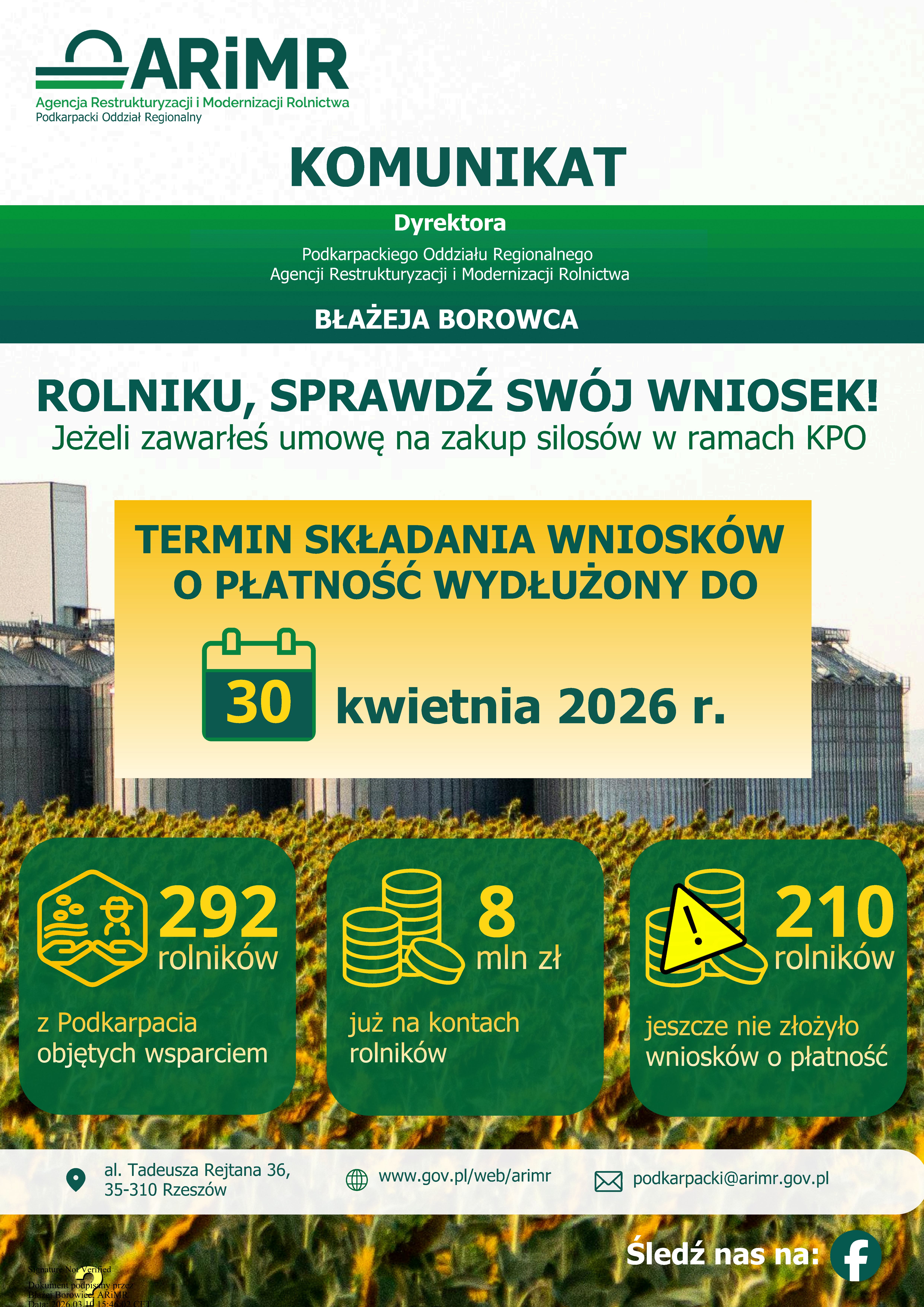 Komunikat Dyrektora Podkarpackiego oddziału Regionalnego Agencji Restrukturyzacji i Modernizacji Rolnictwa