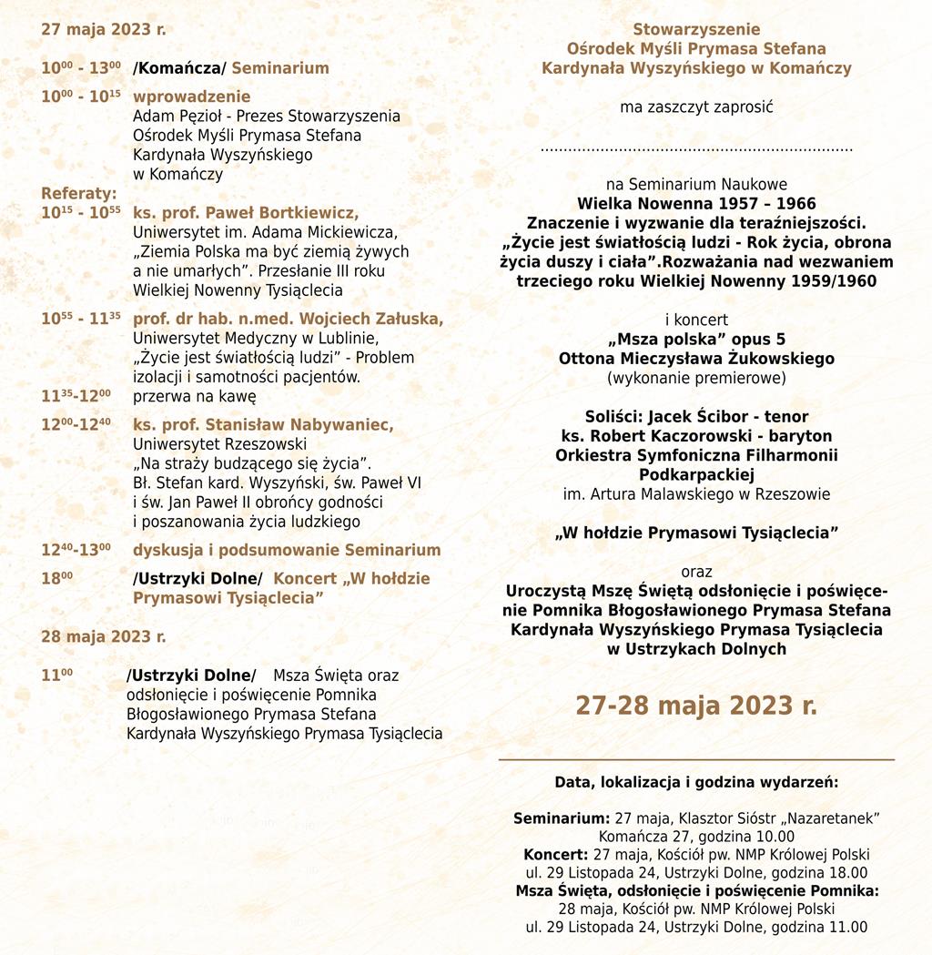 - Niedziela 28.05.2023 r. o godz. 11.00, kościół pw. NMP Królowej Polski w Ustrzykach Dolnych - uroczysta Msza Święta, odsłonięcie i poświęcenie Pomnika Błogosławionego Prymasa Stefana Kardynała Wyszyńskiego