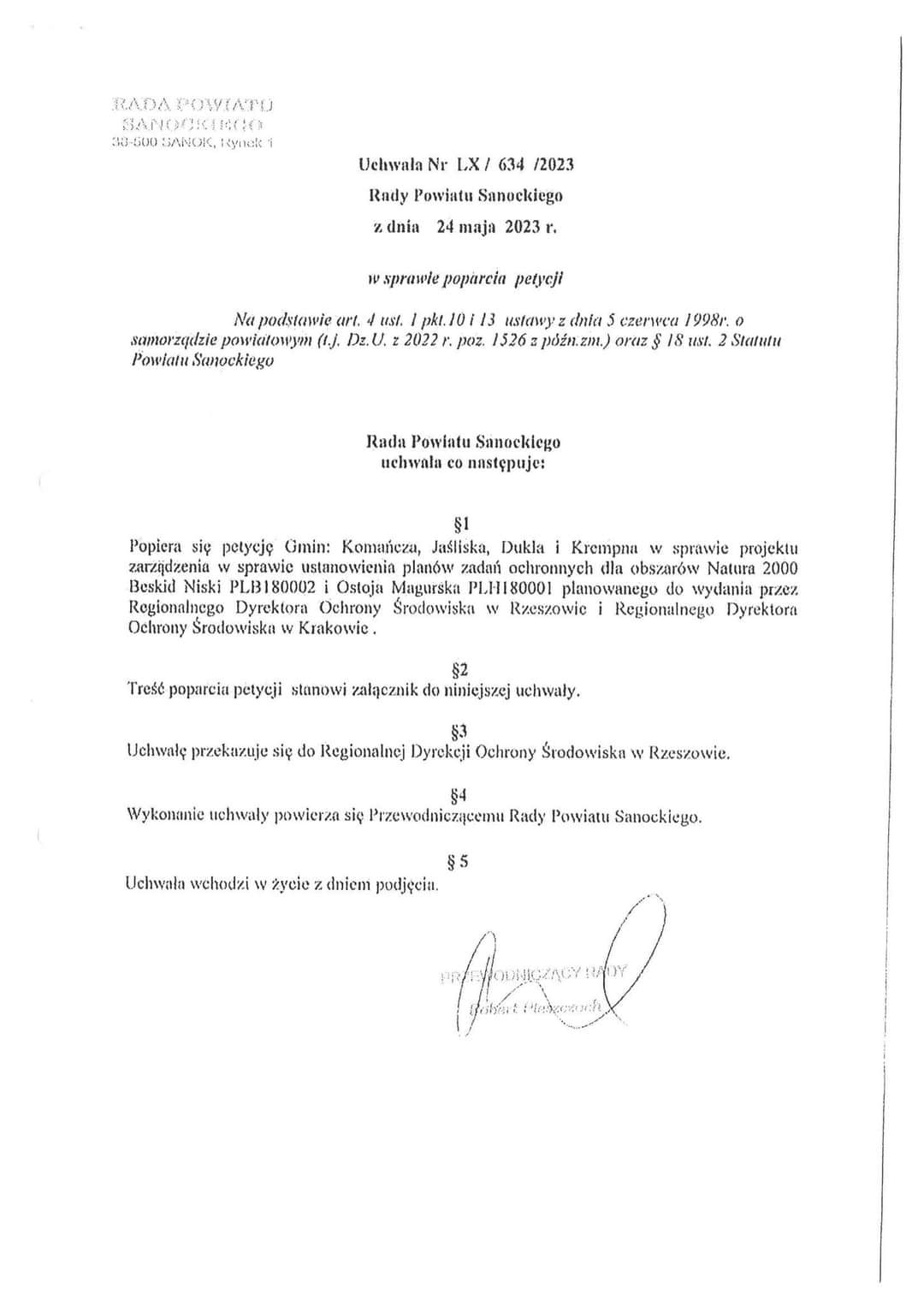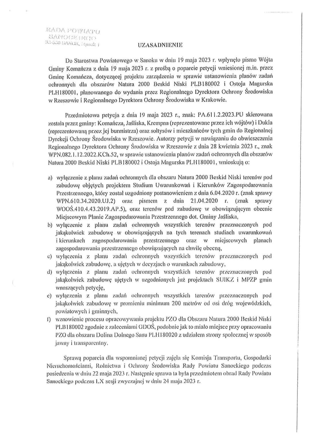 Rada Powiatu Sanockiego Uchwałą nr LX/634/2023 z dnia 24 maja 2023 r. także poparła petycję Gmin: KOMAŃCZA, JAŚLISKA i DUKLA w sprawie ustanowienia planów zadań ochronnych dla obszarów Natura 2000 Beskid Niski PLB180002.