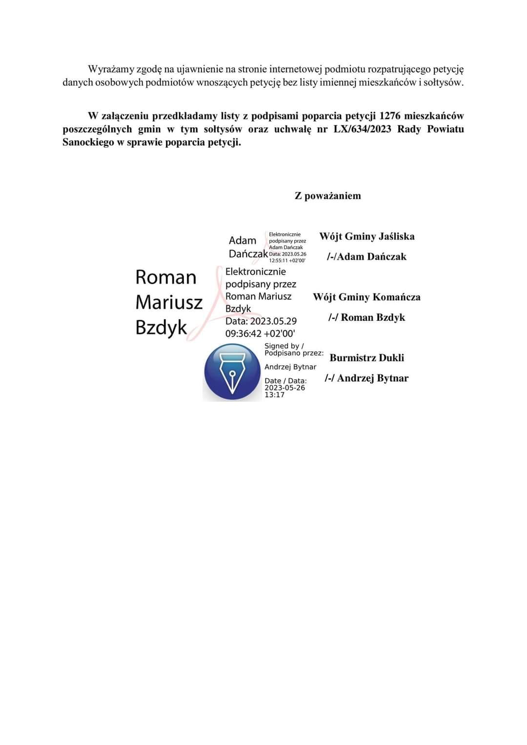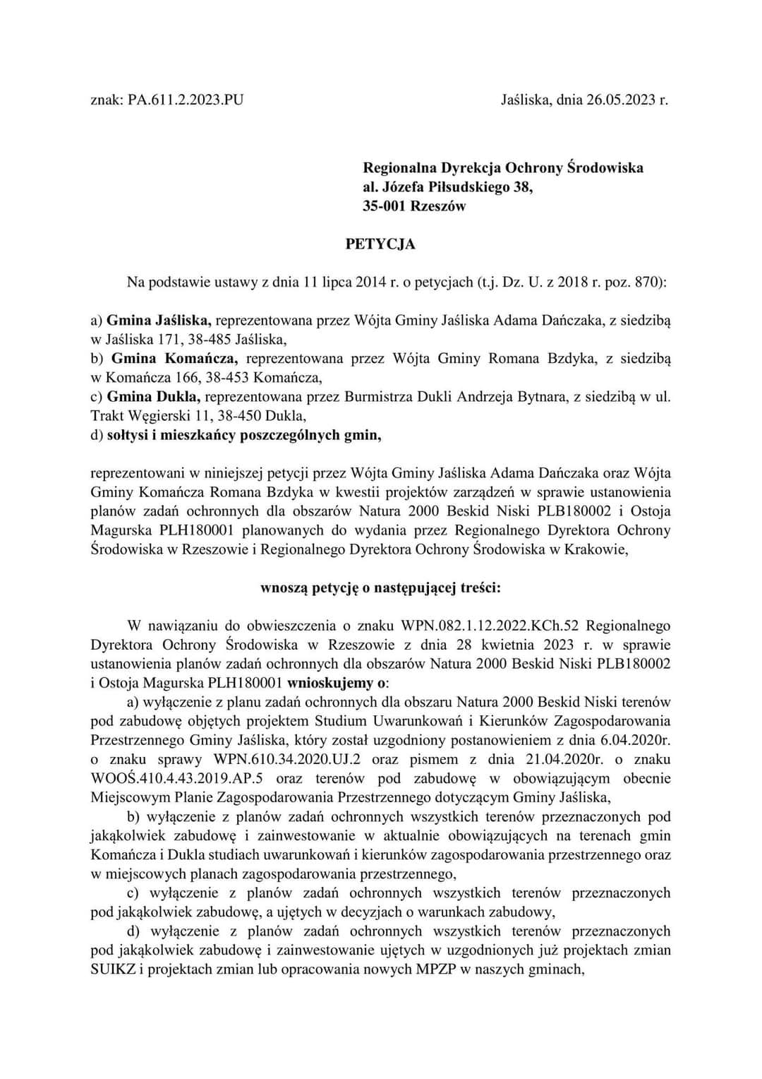 Petycję Gmin KOMAŃCZA, JAŚLISKA i DUKLA