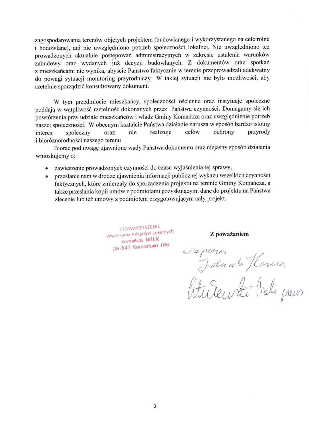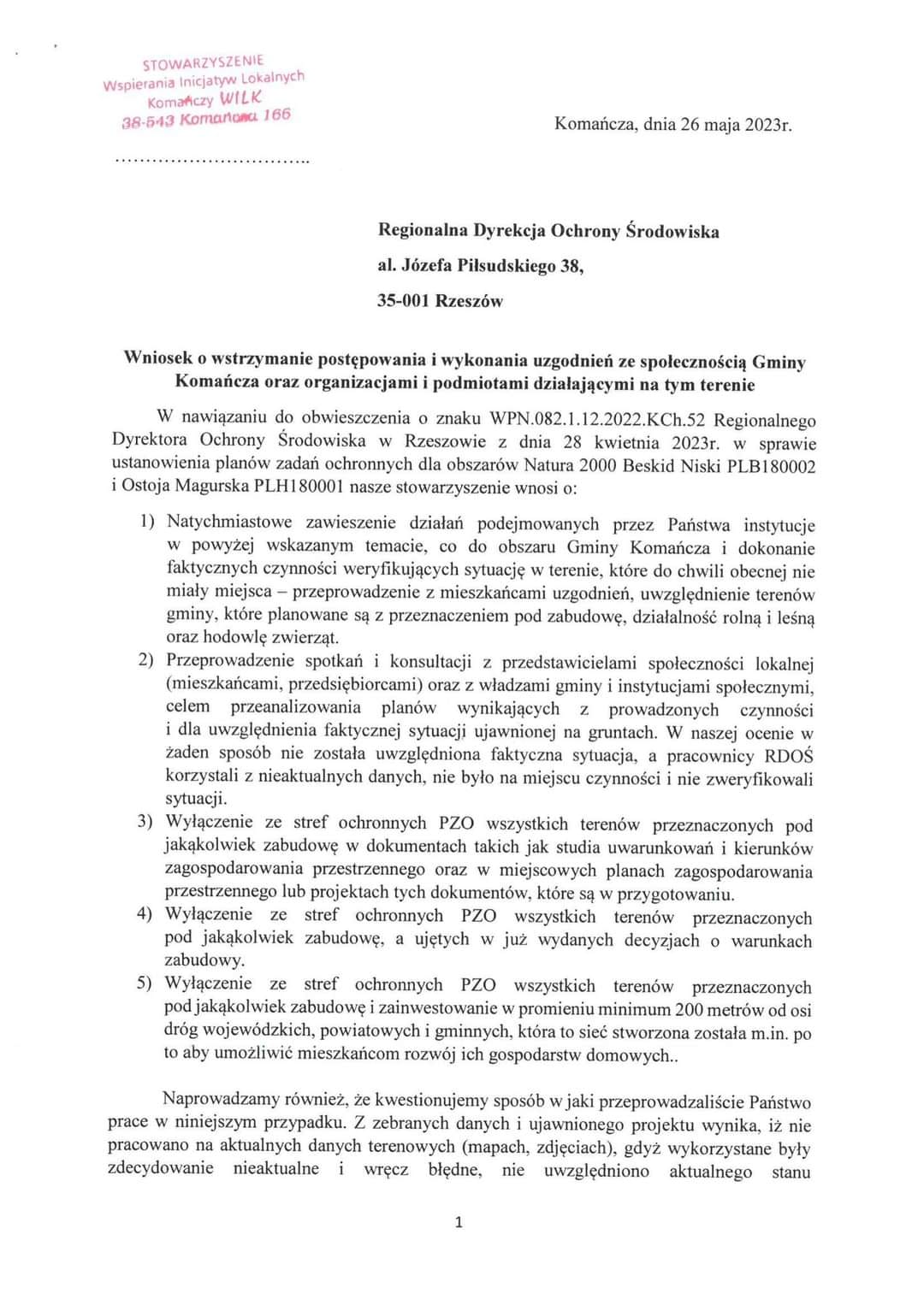 Wniosek Stowarzyszenia Wspierania Inicjatyw Lokalnych Komańczy (WILK) o wstrzymanie postępowania i wykonania uzgodnień ze społecznością Gminy KOMAŃCZA oraz organizacjami i podmiotami działającymi na tym terenie.