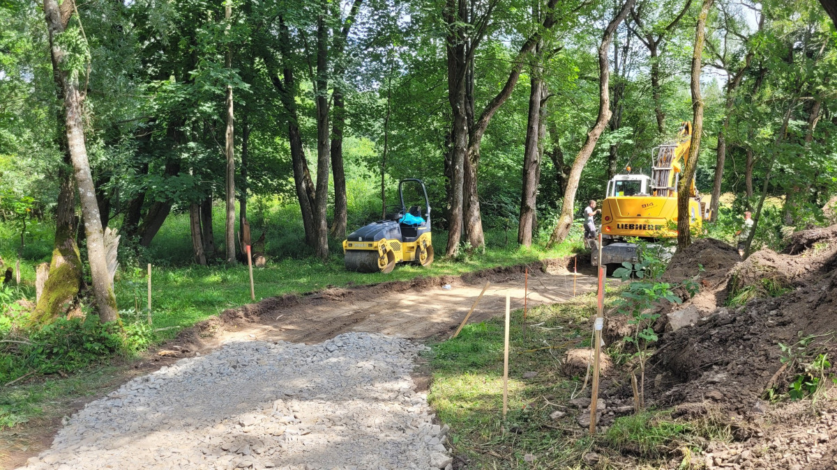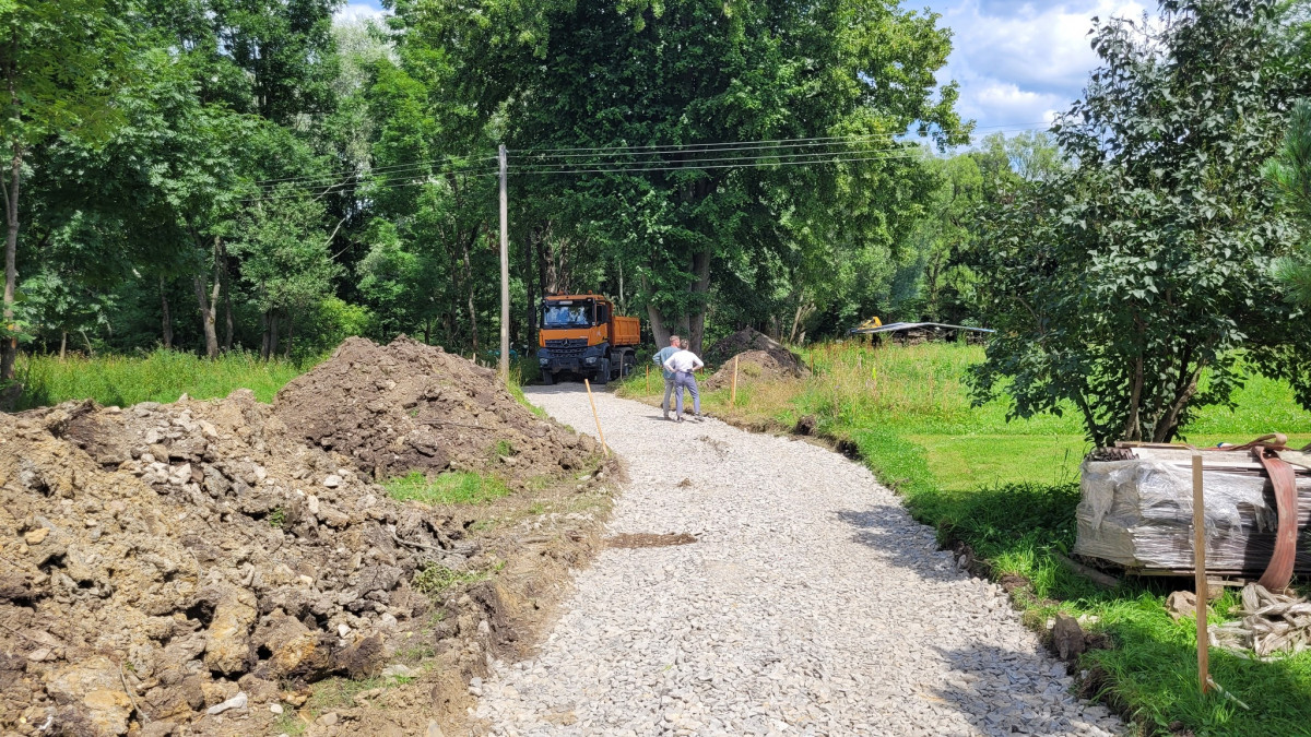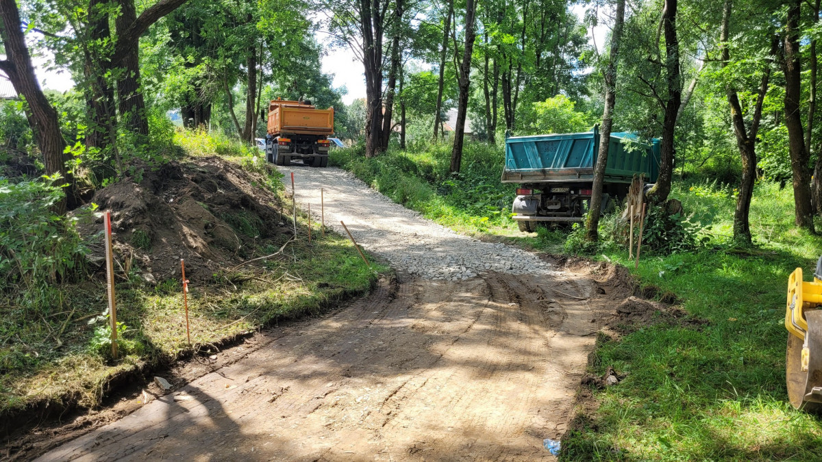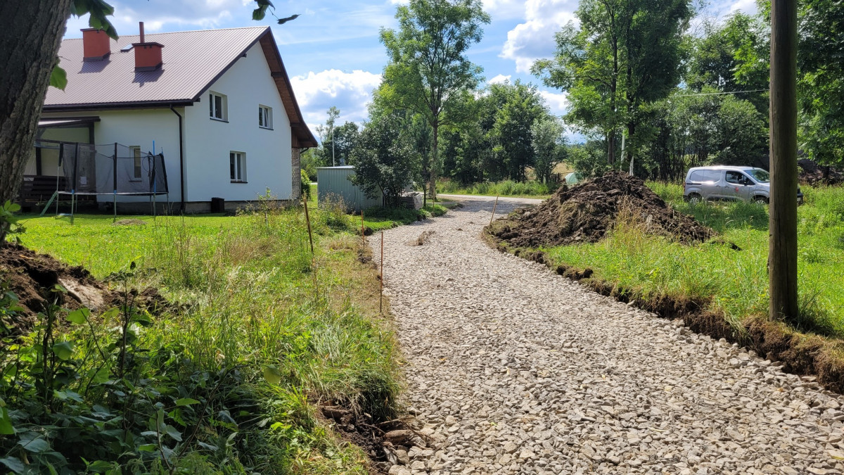 W zakresie prac wykonano roboty przygotowawcze, w tym roboty pomiarowe przy liniowych robotach ziemnych, mechaniczne karczowanie pni, usunięcie warstwy ziemi za pomocą spycharki i wykonanie koryta, wykonanie podbudowy poprzez profilowanie i zagęszczanie mechaniczne podłoża pod warstwy konstrukcyjne nawierzchni, wyłożenie podbudowy z kruszywa naturalnego, wykonanie warstwy wzmacniającej grunt pod warstwy technologiczne z geowłókniny, wyrównywanie istniejącej podbudowy tłuczniem sortowanym zagęszczanym mechanicznie, wykonanie części nawierzchni z mieszanek mineralno-bitumicznych grysowych z warstwą wiążącą asfaltową oraz budowa nawierzchni z płyt żelbetowych pełnych.
