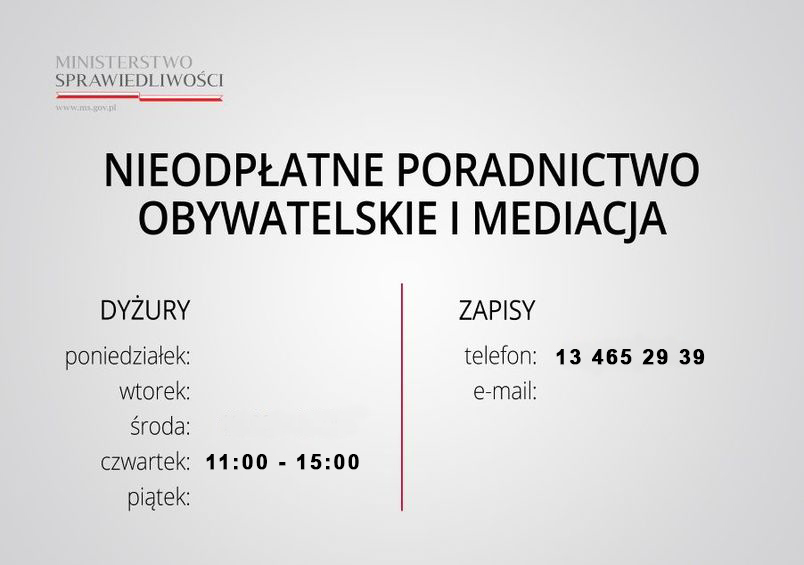 - czwartki - w godz. od 11.00 do 15.00 (specjalizacja „nieodpłatna mediacja”).